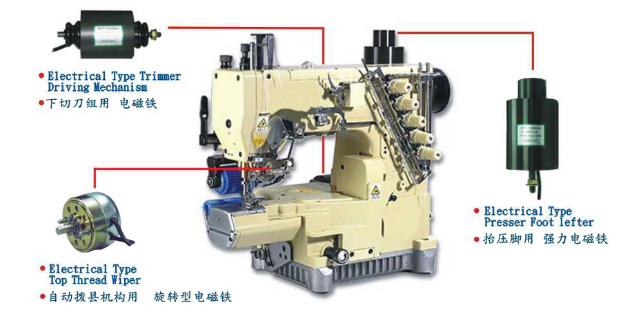 全球主要的工业用缝纫机都可以找到鼎睿各种不同的电磁铁。包括通用于平车的自动倒缝电磁铁、自动切线电磁铁、自动抬压脚、自动过线、自动拨线,以及高头车所使用的沙拉组等。我们的工程师团队会依照客户的机构设计,电气要求与使用条件,订定客制化规格,提高吸引力,增加作动行程或改善噪音等解决方案,同时透过以锻品取代车床的生产技术,协助客户提高产品市场竞争力。